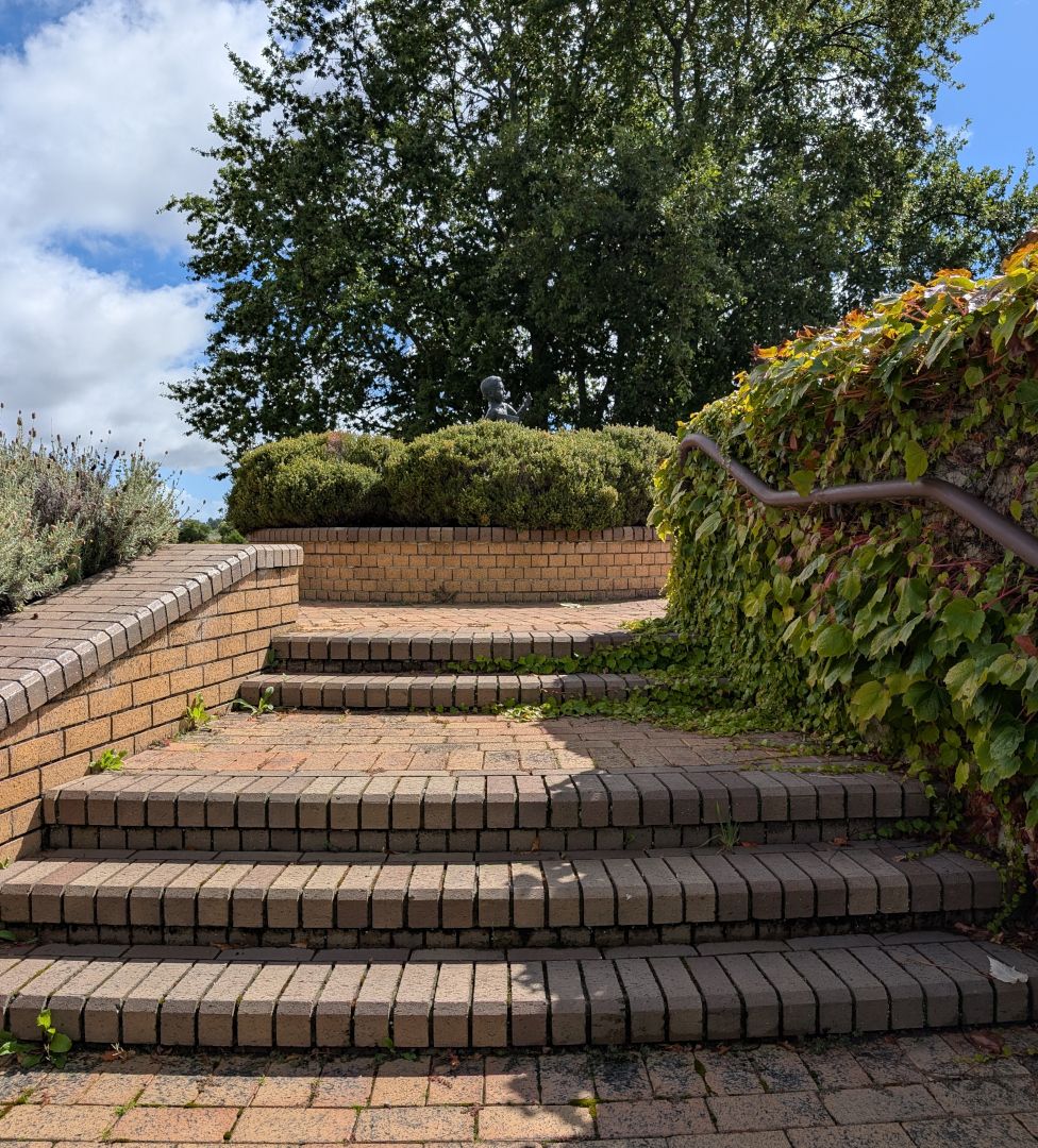 The sculpture is located at the apex of the memorial up several flights of stairs. A ramp that leads back down from the sculpture to the ground level features 14 information panels that detail various moments in ‘Ern’ Rutherford’s life, with a primary focus on his professional achievements and some attention to his personal life, supported by historic photographs, letters, news articles, official records, quotes, and other ephemera. Mounted on the leading walls of the ramp are the names and crests of various educational institutions at which he studied, taught and completed his research.