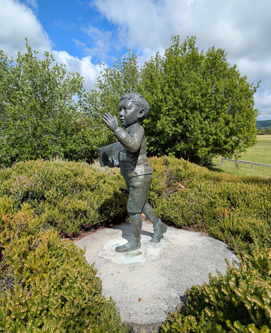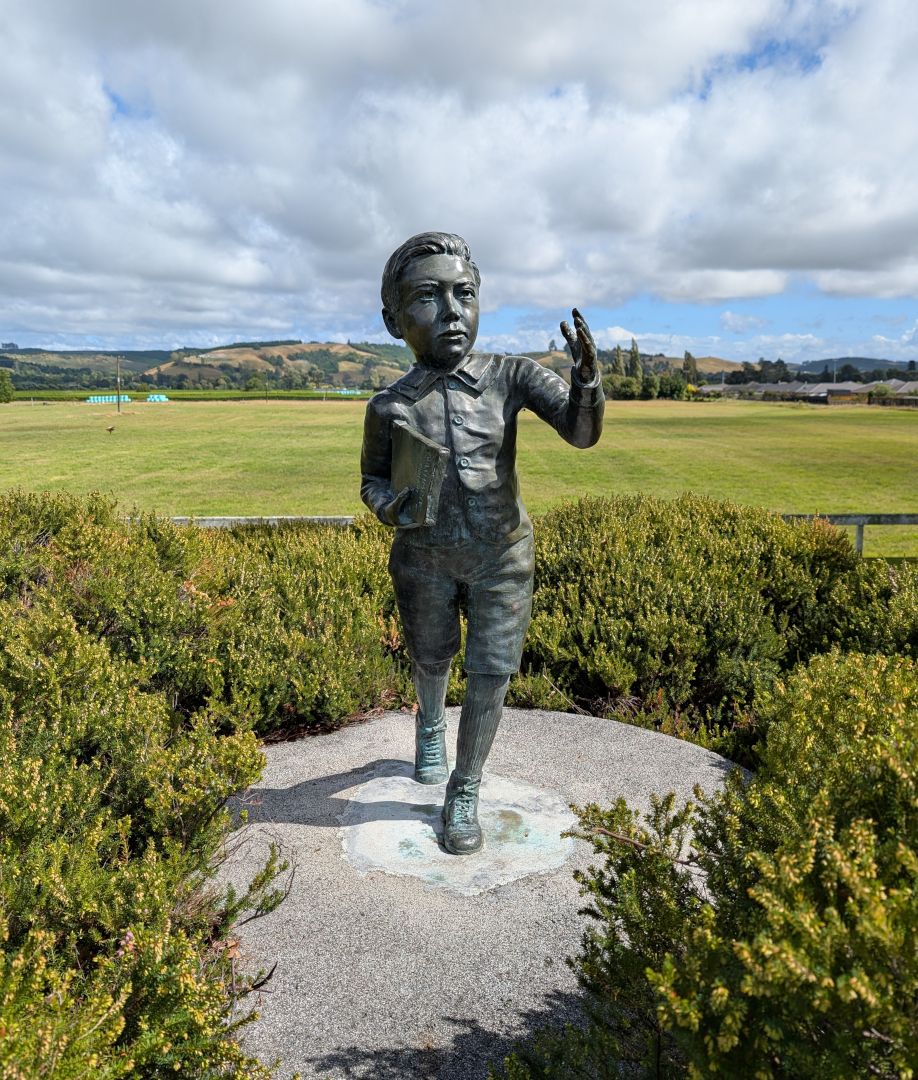This sculpture is part of a memorial complex, “The Rutherford Origin”, built on the site of the birthplace of scientist Ernest Rutherford, who won the Nobel Prize in Chemistry in 1908. It is described as “A tribute to one who rose from humble beginnings in rural New Zealand to world eminence. It is also to show New Zealand children that they too can aspire to great heights.”