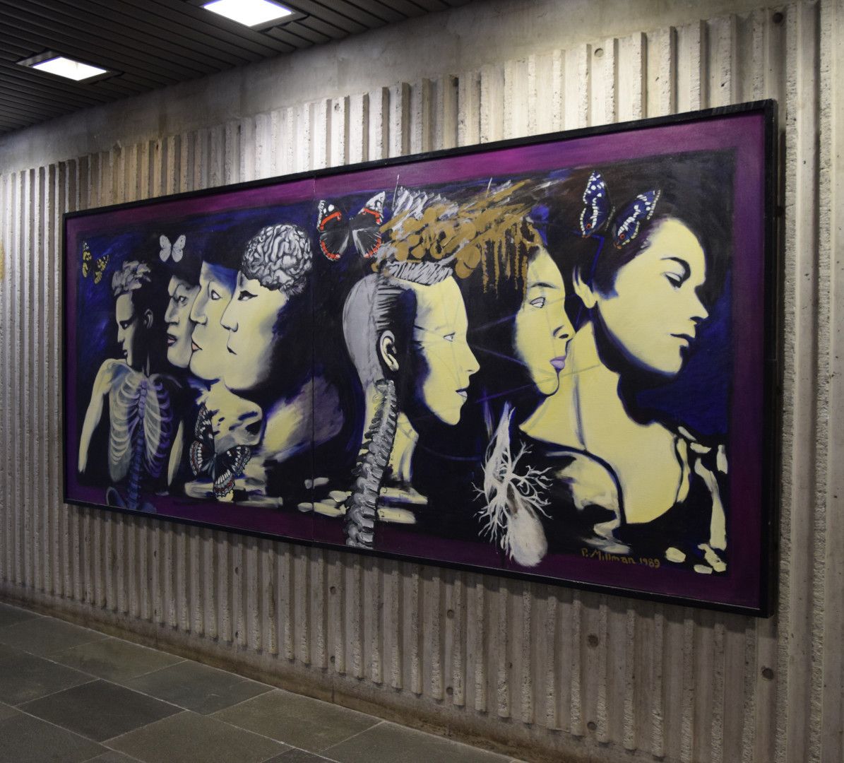 This mural depicts a series of portraits emerging starkly from a dark field. The theme is anatomical, with emphasis on the brain: a nod to the work's sponsor, world-leading brain researcher Richard Faull KNZM.