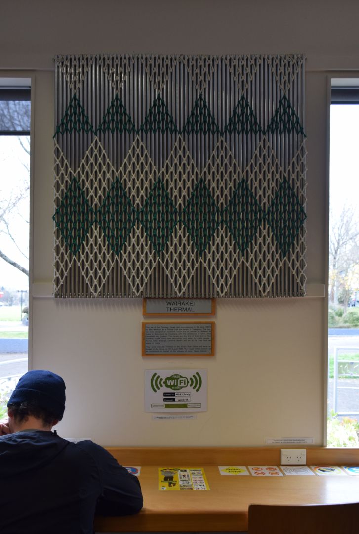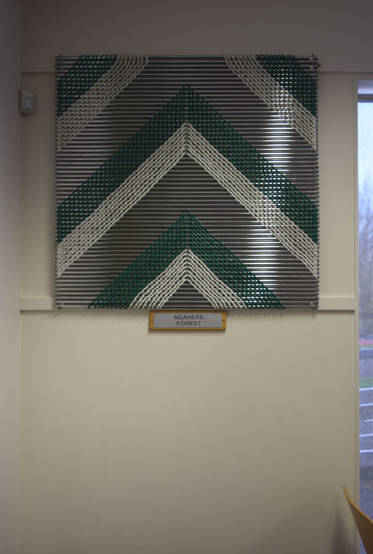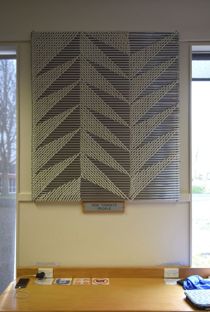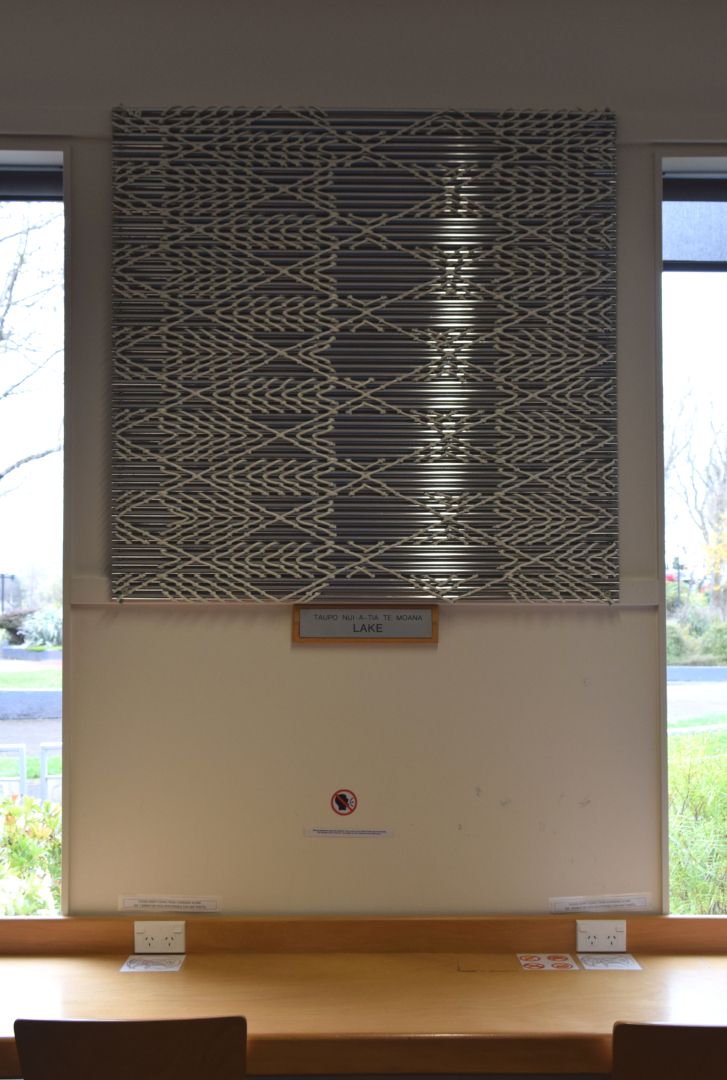 Likely to be the first of their kind in Aotearoa New Zealand, the five panels are a modern adaptation of the traditional approach to tukutuku, and assembled from industrial materials including telephone cable (plastic electrical insulation tubing) chromed pipe and held together with round headed bolts.