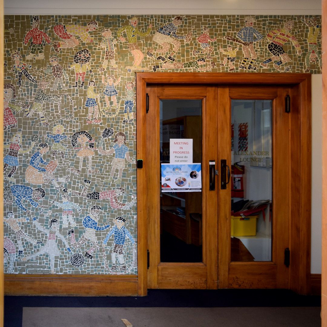 The Children's Mosaic in the Alexander Heritage and Research Library | Te Rerenga Mai o Te Kāuru was created by the students of the nearby Queen's Park School. The mosaic depicts joyous children playing outside on the grass. Many visitors to the mosaic still recall the part of the mosaic that they worked on.