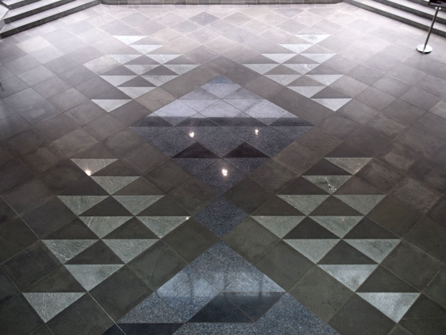 “The participation of Auckland architect Rewi Thompson was also sought, to ensure that the interiors reflected a sense of unity in diversity. He developed a consistent set of guidelines within which a selection of New Zealand artists and sculptors from all local cultures could contribute works suitable for the building. A theme of “Fire and Water” was adopted as particularly appropriate to the Auckland region, referring to its volcanic history and its water surrounded character. Thompson was responsible for the tiled floor in the entrance lobby which depicts a mat incorporating images of mountains, headlands and volcanoes of the region.”