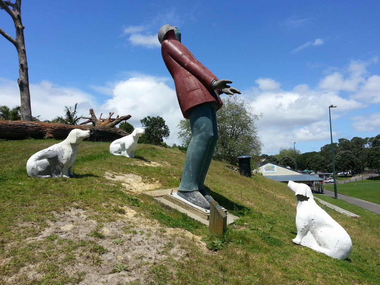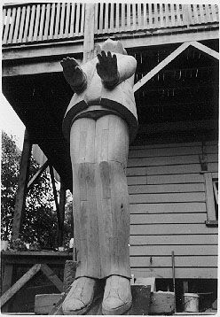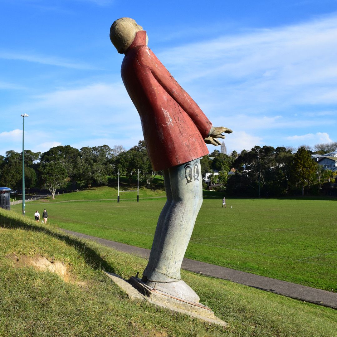 A large-scale human figure leaning back into slope, hewn from macrocarpa. The artist has described the figure as a portrait of a friend who was seen warming his hands over a barbecue.