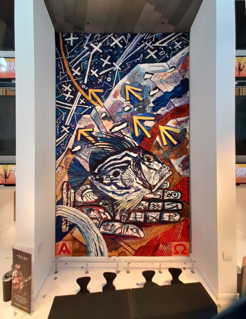 ‘The Aotea Tapestry’ hangs in pride of place between the doors to the Kiri Te Kanawa Theatre in Aotea Centre, hanging from level 4 to level 2. The tapestry can be viewed from the McConnell Dowell Balcony between doors D and E on level 4, from the BNZ foyer also on level 4, and between doors A and B on the Owens Foyer on level 2.