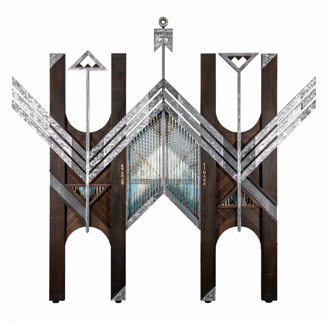 "Ata Whenua is a reflection on a statement made by Nōpera Panakereao at the conclusion of the signing of the Treaty at Kaitāia on 28 April 1840 which implied that the ATAKAU (shadow) would go to the Governor while the TINANA (substance) would remain with Māori. A year later Panakareao would invert the statement. The lead inlays of ATAKAU and TINANA recall the prophetic statement while the spiral and cross mirror Māori signatures on the Treaty of Waitangi. Kaokao is the major motif that translates across the stylised tiki forms as a statement of protest and discontent. The central panel is conceived as a whare of reconciliation while the stylised tekoteko stands as a prophetic emblem of justice."