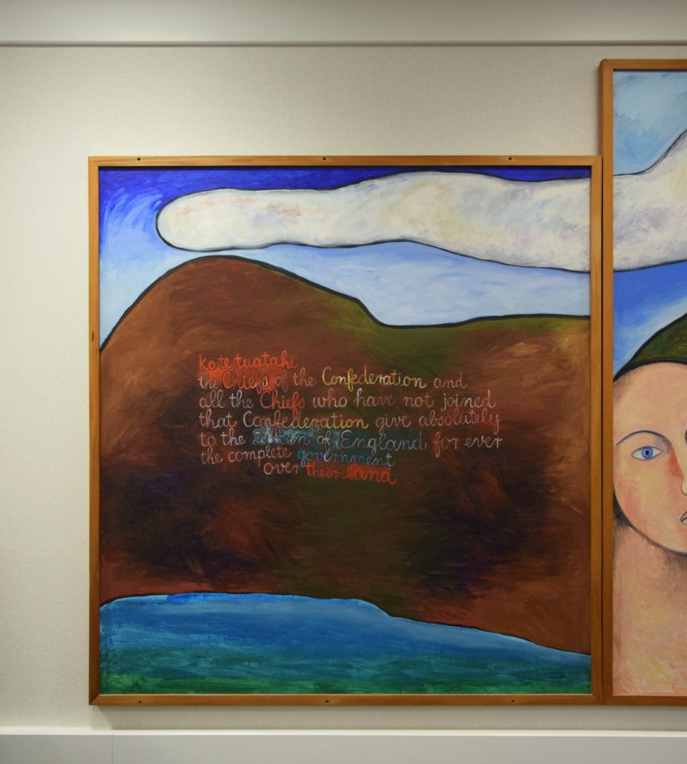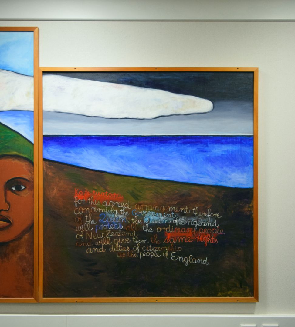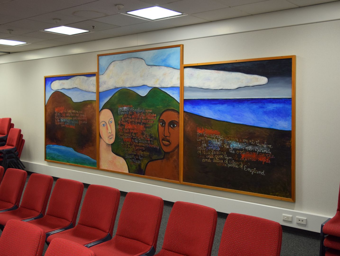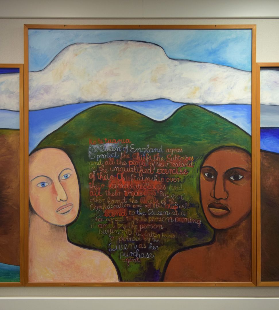 “This triptych comprises a large oil on canvas framed with rimu moulding exploring themes arising from the Treaty of Waitangi, the country’s founding document.