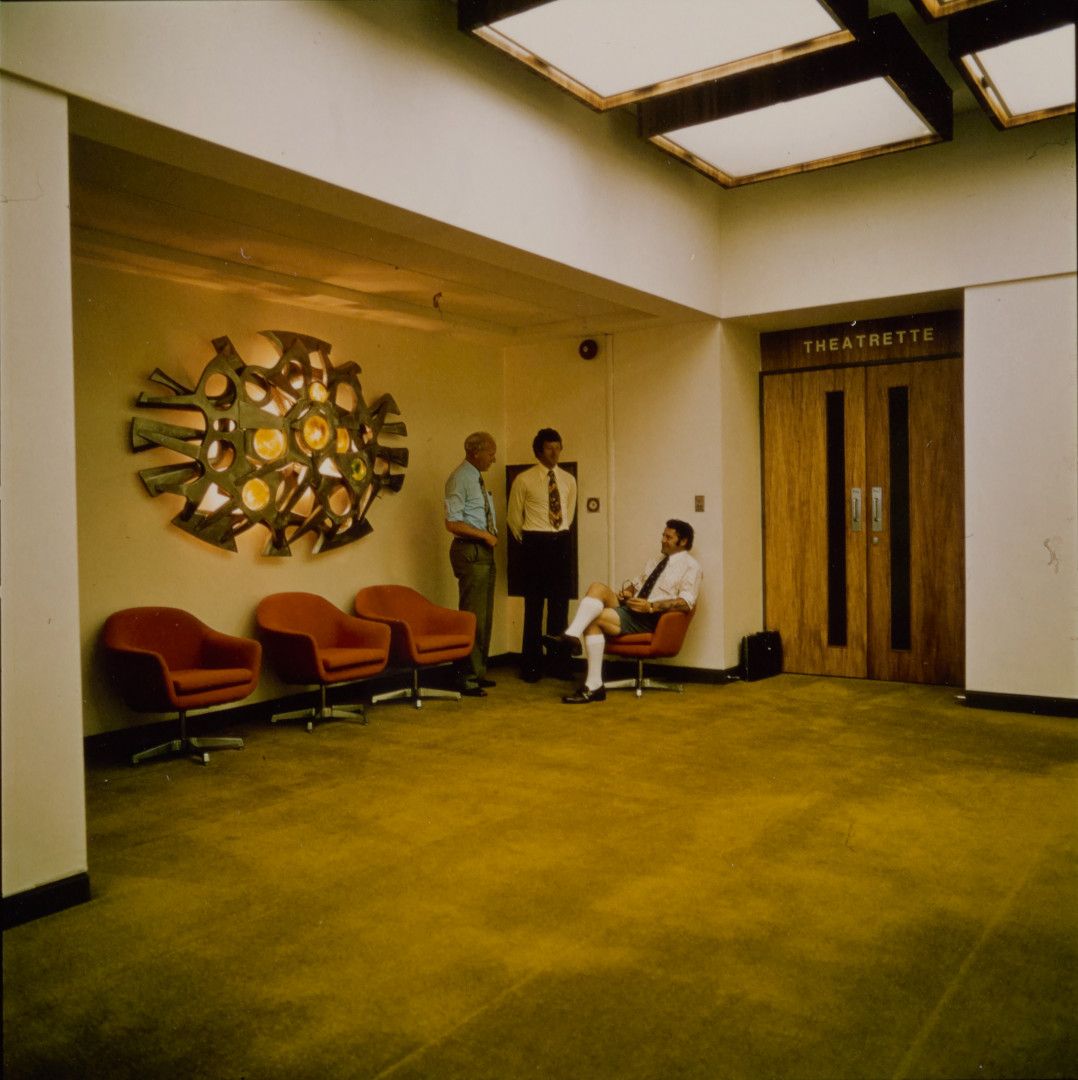 Roy Cowan's wall sculpture in the foyer of the BP House theaterette, Wellington, 1978. Reproduced with permission of Alexander Turnbull Library, Wellington, N.Z. PAColl-9842-33-03