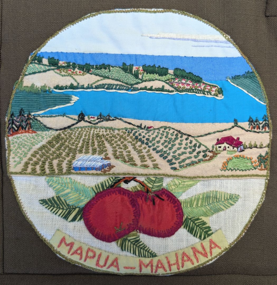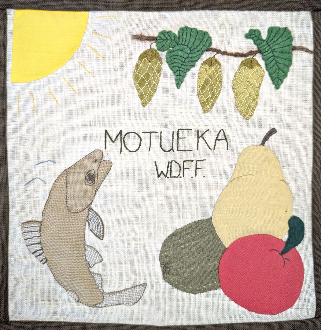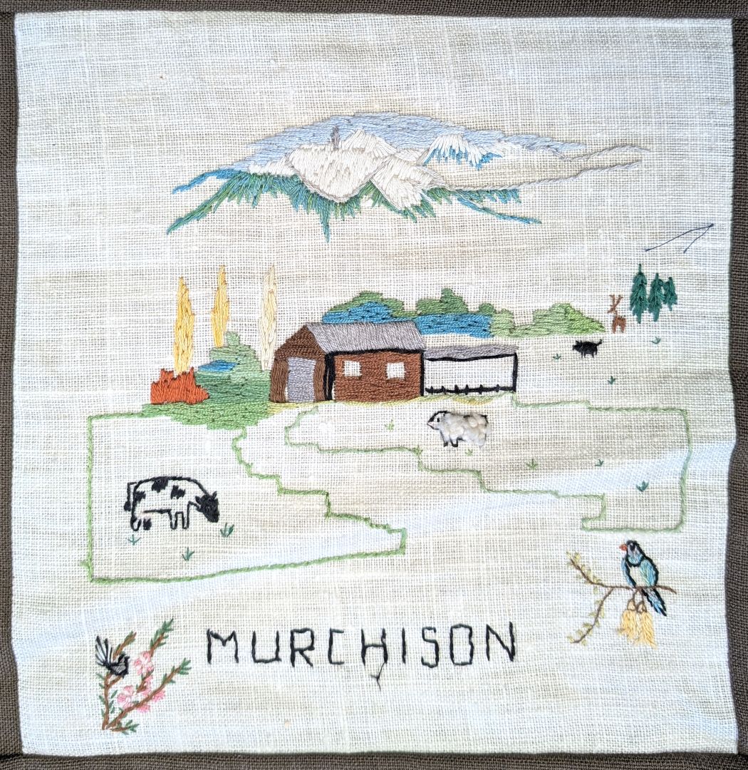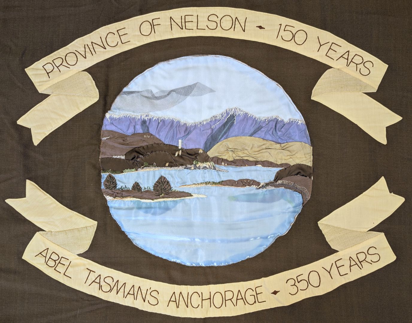 This quilt was made by branches of the Women’s Division of Federated Farmers in the Tasman District in conjunction with the Tasman District Council. It commemorates 150 years of European settlement in the Nelson Province and the 350th Anniversary of Abel Tasman’s anchorage in 1992. Each branch has depicted something of significance to its area.