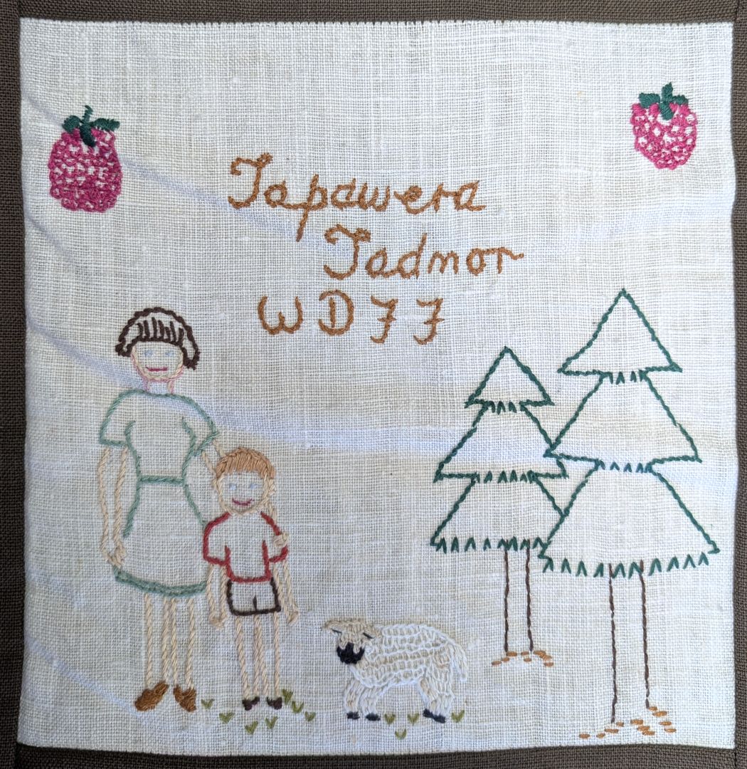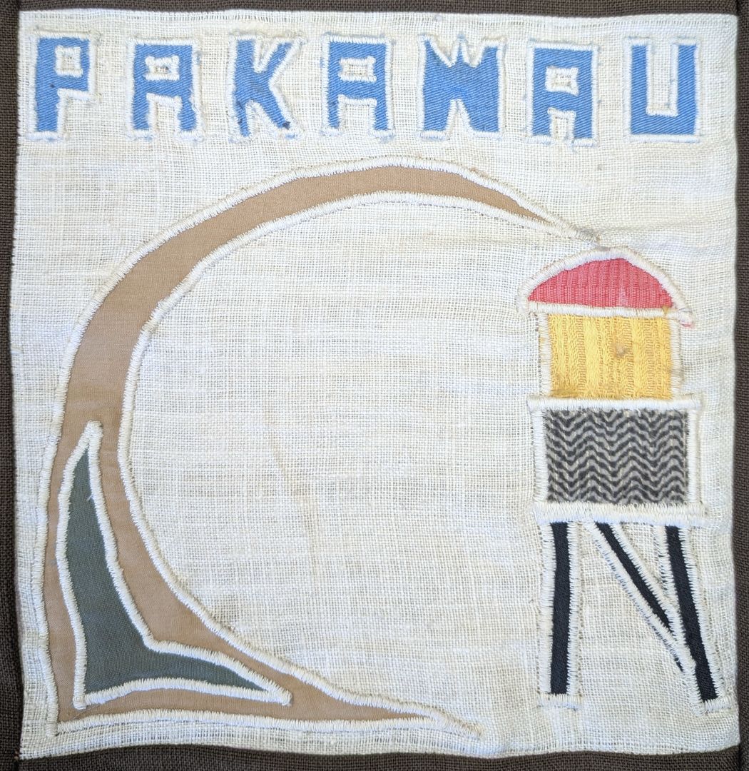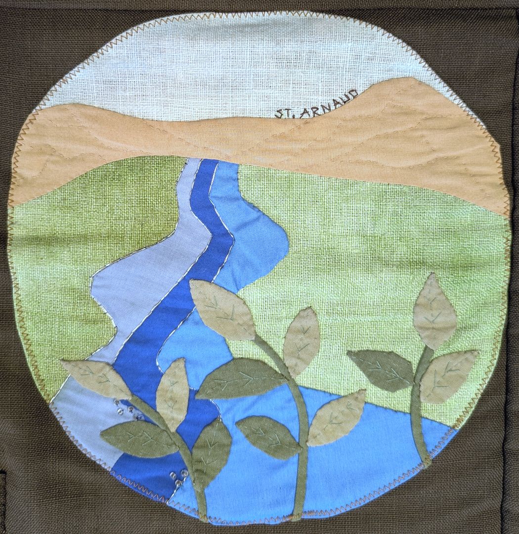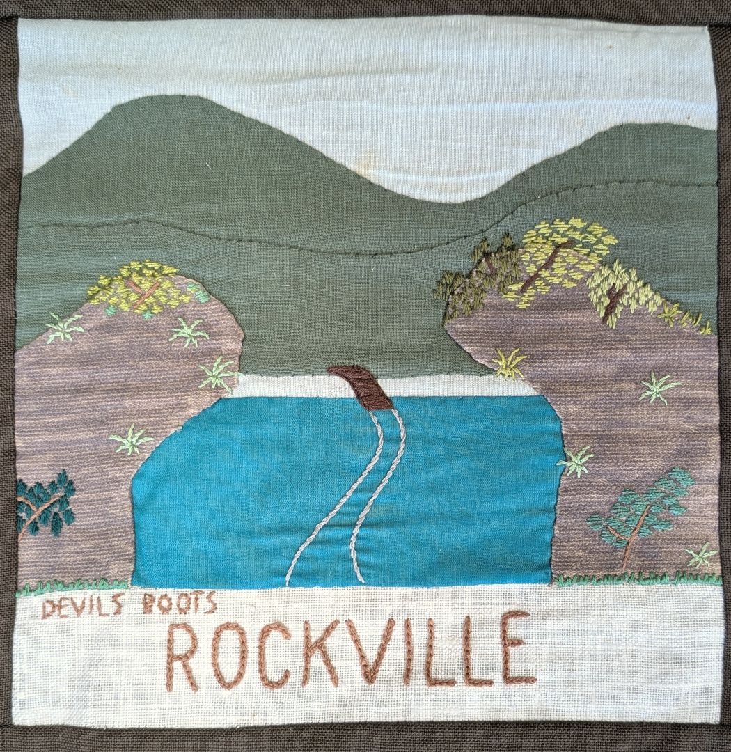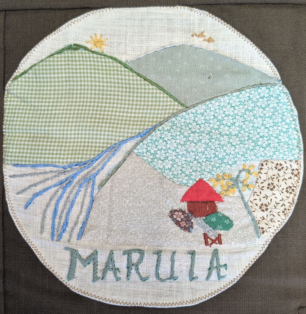 This quilt was made by branches of the Women’s Division of Federated Farmers in the Tasman District in conjunction with the Tasman District Council. It commemorates 150 years of European settlement in the Nelson Province and the 350th Anniversary of Abel Tasman’s anchorage in 1992. Each branch has depicted something of significance to its area.