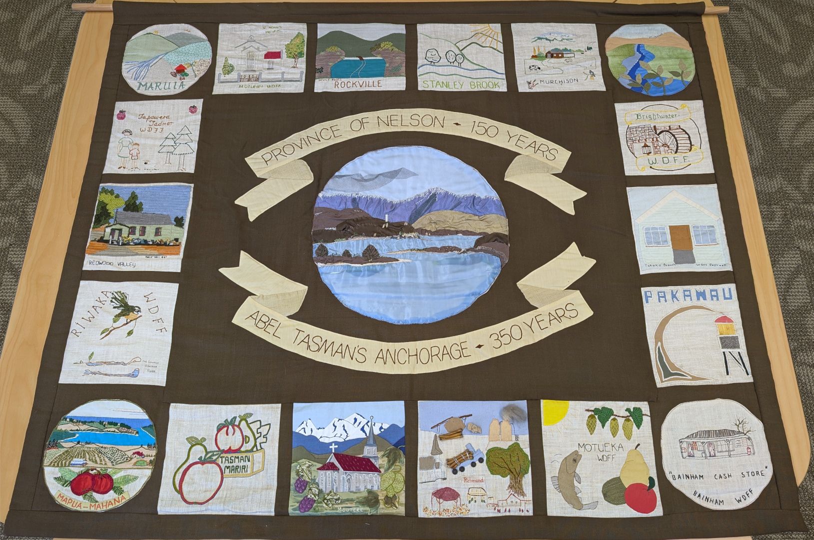 Women’s Division of Federated Farmers (now Rural Women New Zealand), ‘Province of Nelson - 150 years commemorative quilt’ (1992), Richmond Library, Waimea Richmond, Te tai o Aorere Tasman District