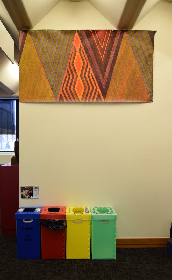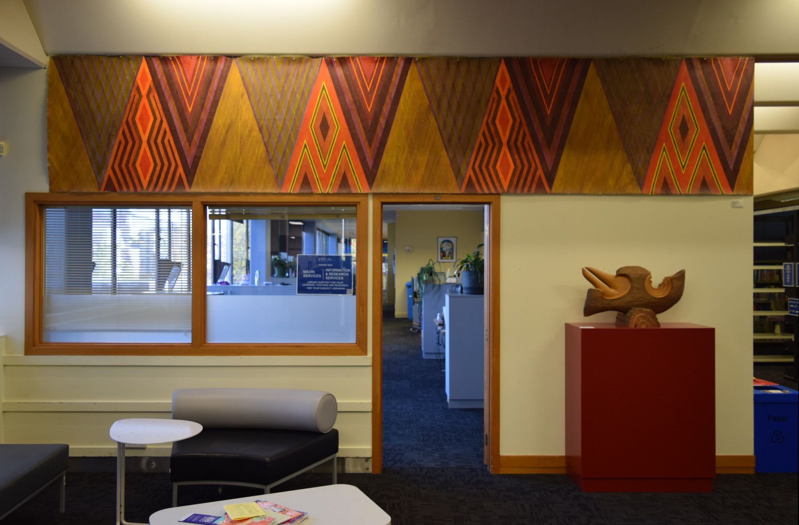 Canvas is hung as a frieze wrapping around an external corner of wall, above doors and windows. The painting is made up of a repetitive geometric pattern of isosceles triangles within which further patterns of triangles, diamonds and zigzag lines. Colours include ochre, orange, dark red and mid-brown.