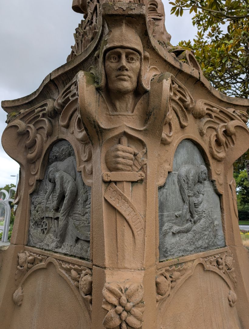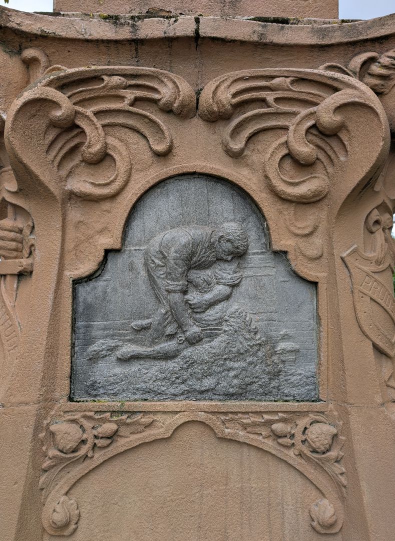 “This was to be the major project to occupy much of Kidson's spare time during 1905. By March he had prepared a model of the memorial and had begun working on the relief panels. Both the model and the relief panel 'shearing' were exhibited at the Canterbury Society of Arts in April. Most of the memorial was eventually sculpted from Sydney sandstone with the relief panels cut from grey Westland sandstone which Kidson worked on at his Cashmere studio.