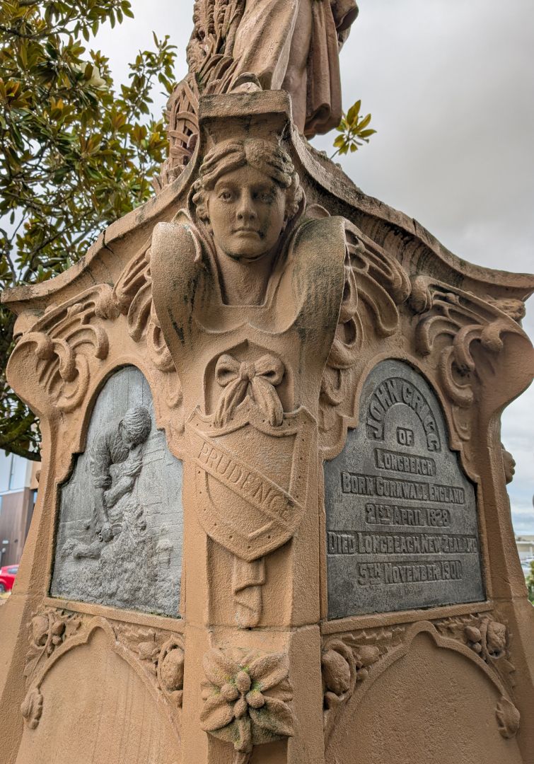 “As a result Samuel Hurst Seager was approached and agreed to design the memorial. He in turn engaged Kidson to carry out the carving under his direction. The memorial design was dominated by the figure of Grigg standing bareheaded, a coat over his arm and a stick in his hand with raupo reeds and drainpipes beneath his feet. The four corner buttresses supporting the base of the statue represented the four virtues, Industry, Prudence, Fortitude and Justice and on the plinth of the statue three bas-relief panels depicting the farming pursuits of ploughing, harvesting, and shearing. A fourth panel bore an inscription.