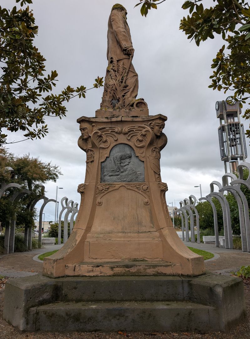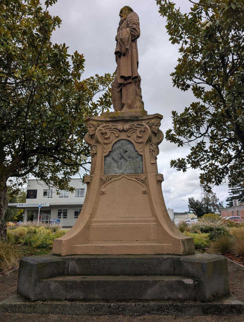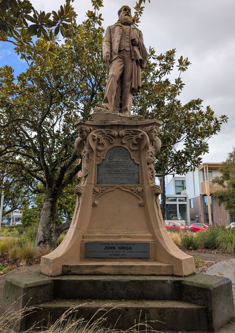 “This statue of pioneer settler John Grigg was unveiled in the centre of Ashburton on Canterbury anniversary day, 16 December 1905, four years after Grigg's death. The memorial was seen as a tribute to a pioneer who had transformed the swampy land around his property at Longbeach into a prosperous farm and had played a leading role in the export of frozen meat from Canterbury. Memorials to pioneers began to appear in small towns around New Zealand in the first decade of the 20th century.”
