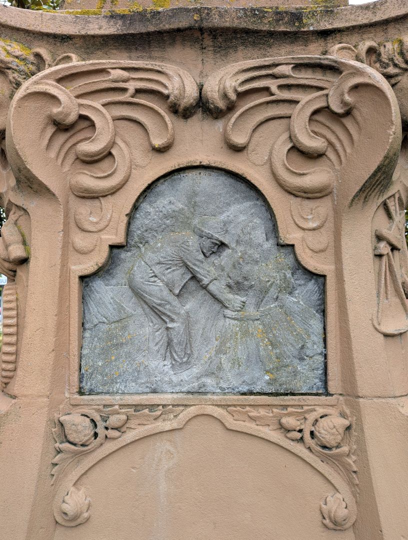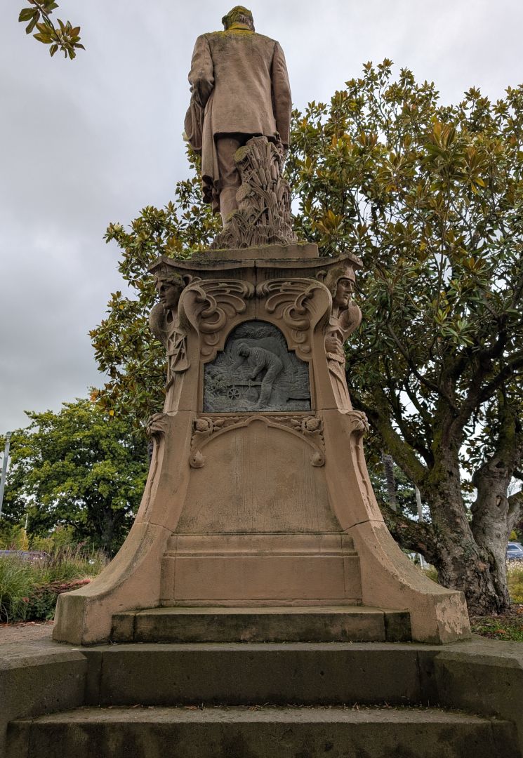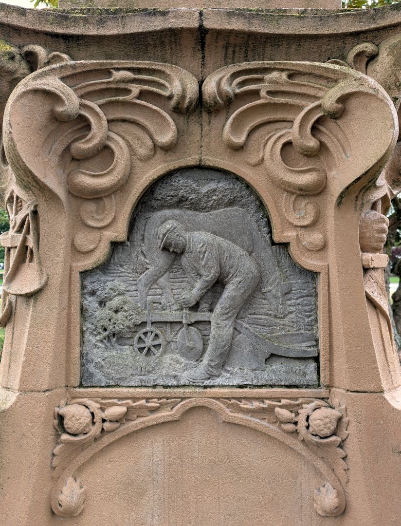 The monument is in two parts: a full-length standing portrait of the pioneer farmer, and a series of relief carvings of farming activities on the pedestal. Grigg is shown informally, holding a coat over his arm. The portrait is naturalistic, and the farming theme is carried through at the rear of the figure where sheaves of wheat help support the bas-relief image.