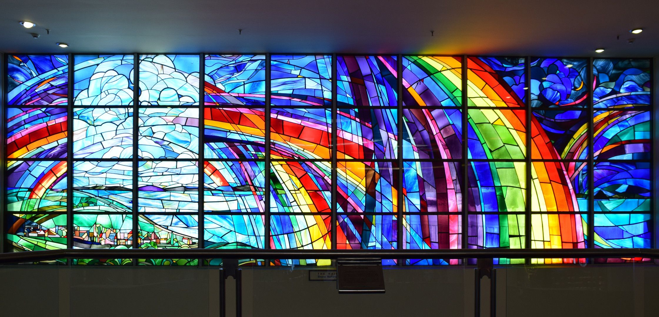 “This striking stained glass window was designed by artist Shona McFarlane. 'The Rainbow' window measures 12 x 4 metres and took almost a year to complete.