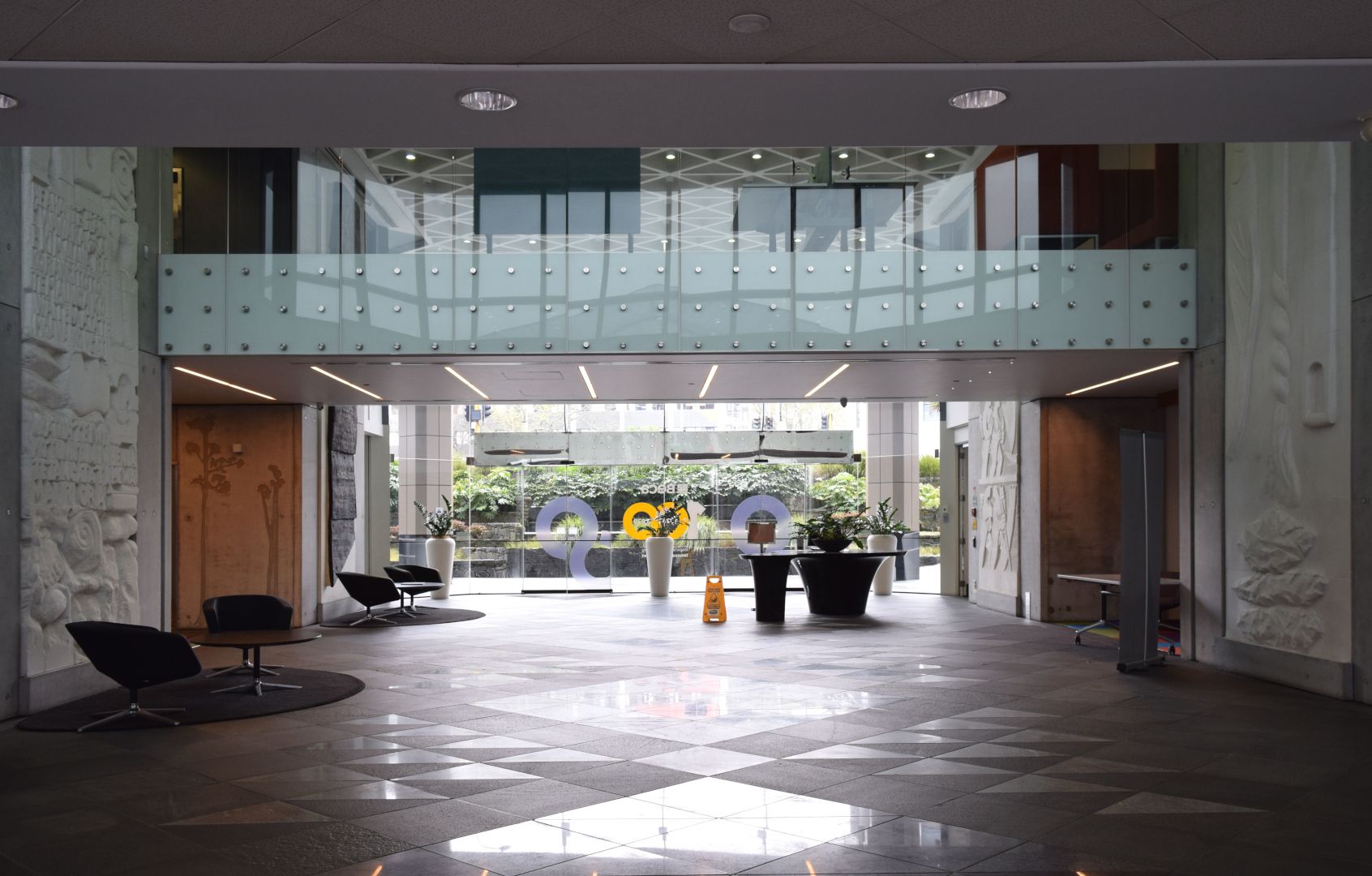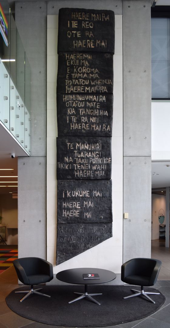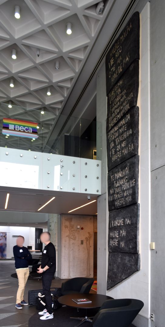 “The participation of Auckland architect Rewi Thompson was also sought, to ensure that the interiors reflected a sense of unity in diversity. He developed a consistent set of guidelines within which a selection of New Zealand artists and sculptors from all local cultures could contribute works suitable for the building. A theme of “Fire and Water” was adopted as particularly appropriate to the Auckland region, referring to its volcanic history and its water surrounded character. Thompson was responsible for the tiled floor in the entrance lobby which depicts a mat incorporating images of mountains, headlands and volcanoes of the region.”