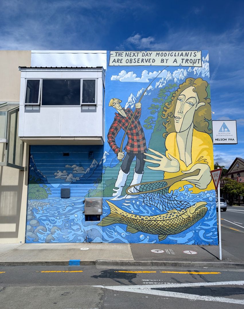 “Modigliani’s Trout is in the style of famous Italian artist Modigliani, known for his use of mask-like faces and elongated forms. It was commissioned by the Youth Hostel Association for their building and features a humorous take on an iconic New Zealand outdoors scene.”