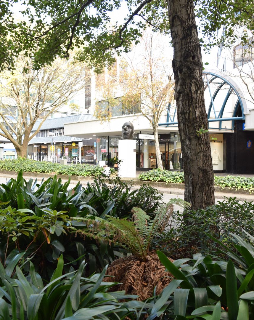Large abstracted head raised on a pedestal between two raised beds of landscape planting. This work was made possible by the Wellington City Council's Arts Bonus Scheme.