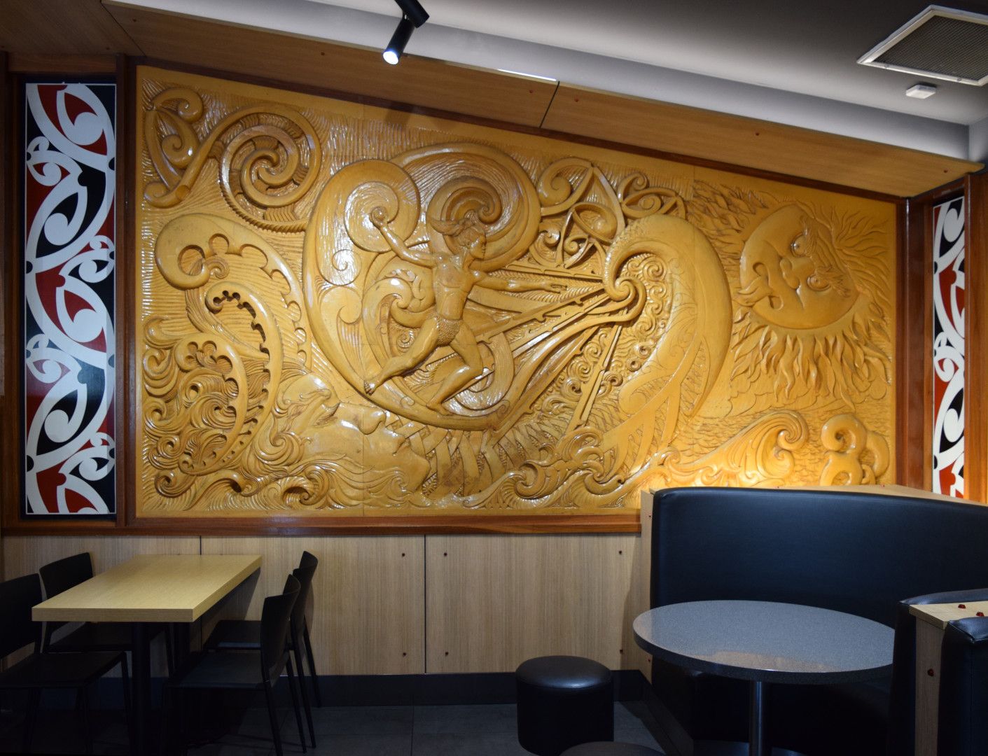 In 1981 McDonald's Rotorua commissioned Tuti Tukaokao to produce artworks for their new building. Tukaokao created a total of 3 pou, 5 murals, 7 kōwhaiwahi panels and other internal carvings. He also completed an external sculpture in 1997.