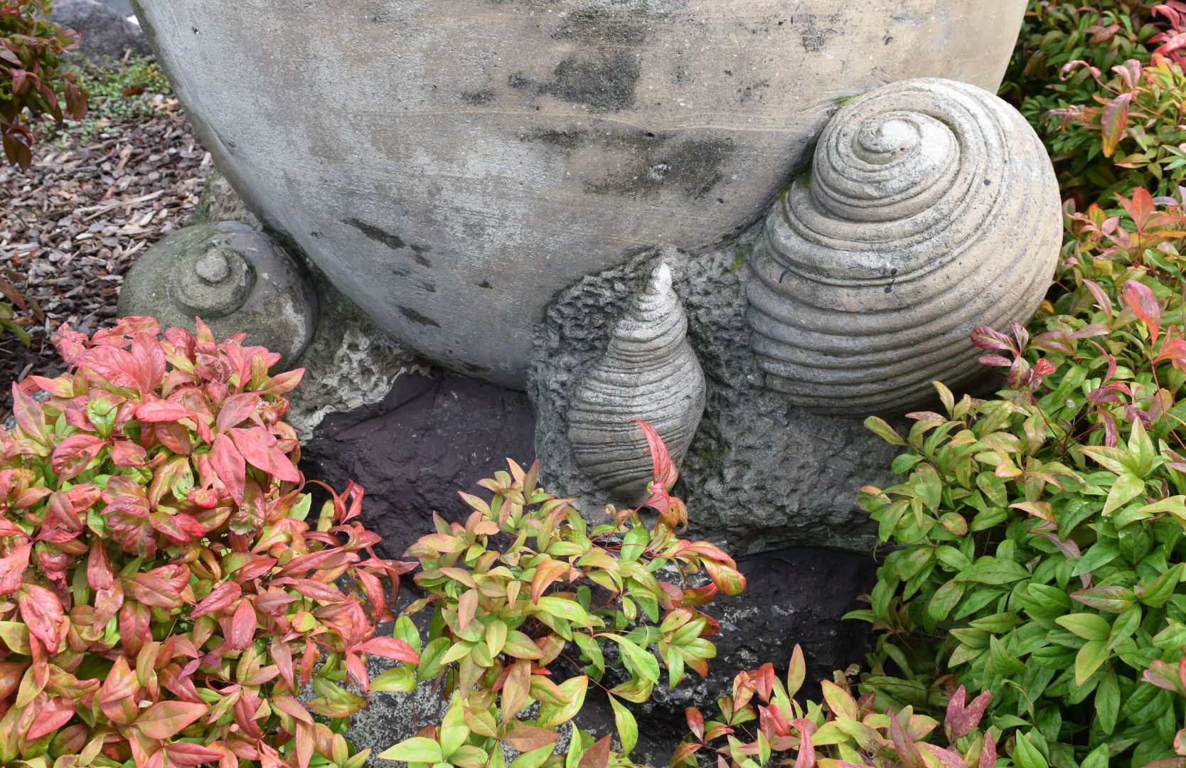 Stone carving of Maui's hook, raised on rocky plinth with shells.