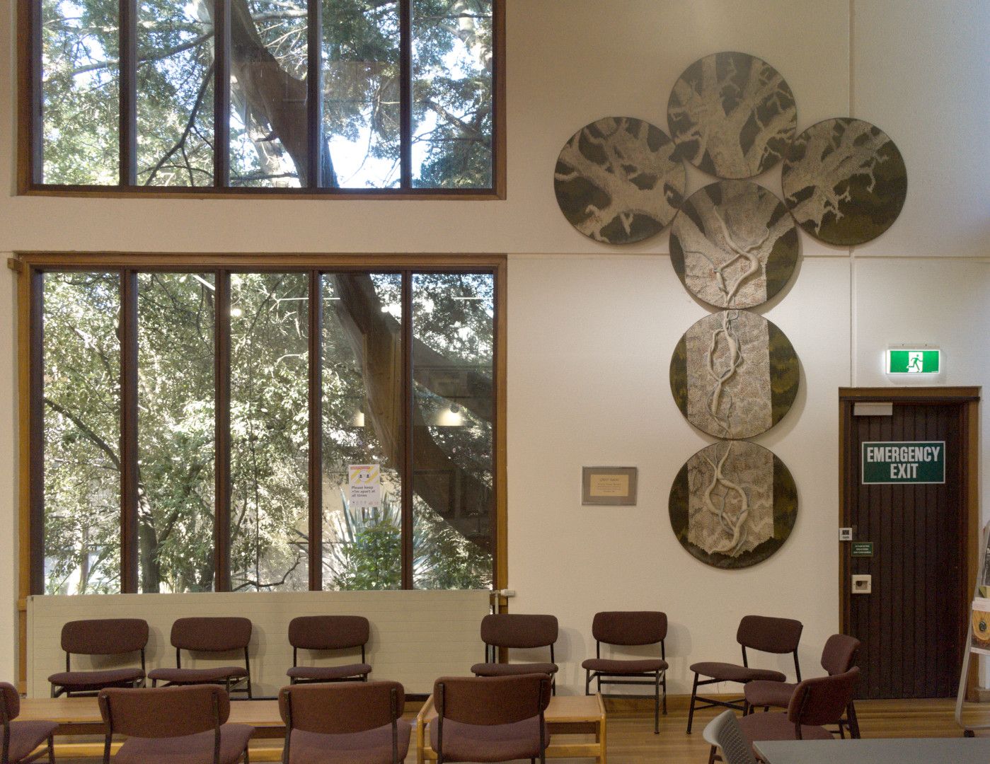 Six circular panels that joint to reveal the form of a giant kauri tree, evocative of Mountford's time in the Waipoua Kauri Forest on the Auckland Peninsula, north of Dargaville. The work demonstrates the artist's concern for conservation and ecological balance. She considered the circle a universal symbol of growth and fulfilment, encouraging contemplation and constant re-evaluation, applicable to both physical and spiritual cycles.